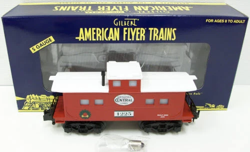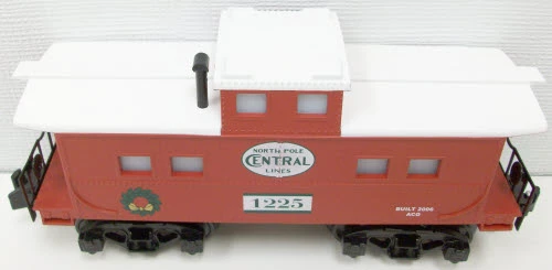 This is an American Flyer 48739 North Pole Central Lines Illuminated Christmas Caboose. Features include die-cast metal trucks, metal frame, and interior lighting.