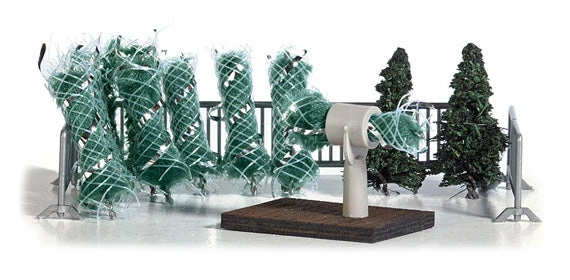 This is a Busch 1182 HO Christmas Tree Sale. It is a Typical Christmas tree sale with 10 trees wrapped already in net for easy transport and 2 fir trees. Including barriers and tree netting machine with netting. Kit.