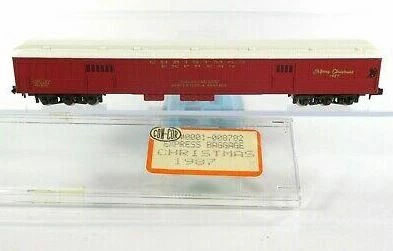 Here is a Con-Cor 0001-008702 N Scale Christmas Express 1987 Passenger Car. This car features metal wheels and a plastic body construction.