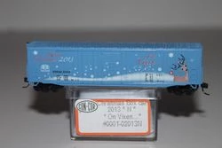Here is a Con-Cor 0001-02013N N Scale Merry Christmas 2013 Box Car. This car features metal wheels and a plastic body construction.