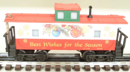 Here is a K-Line K6172 Christmas Caboose. It is lighted. It features plastic construction, metal wheels and axles & has knuckle couplers.