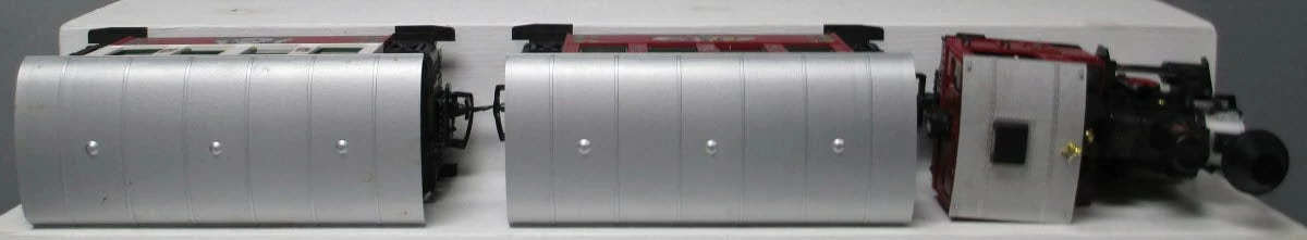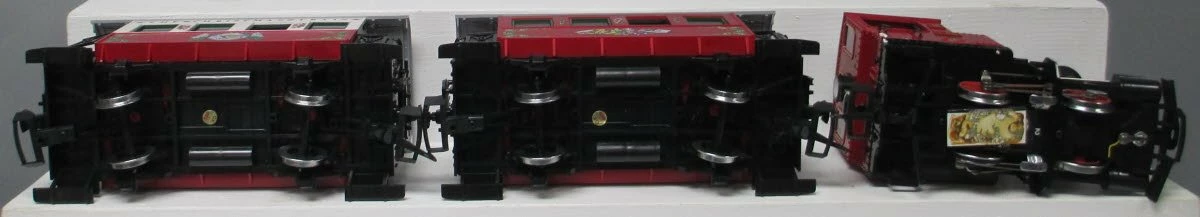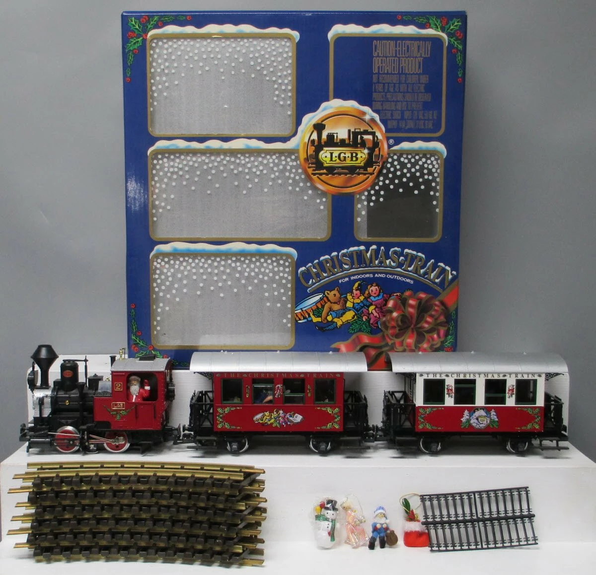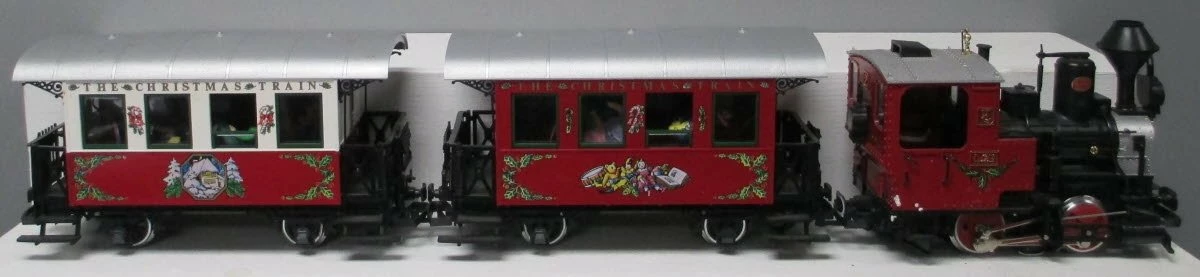 Here is a LGB 20540US G Scale Christmas Santa Train Steam Loco Pasenger Set. These fetaure plastic construciotn, metal and plastic wheels, couplers, and a motor. Please see my pictures for additional features.