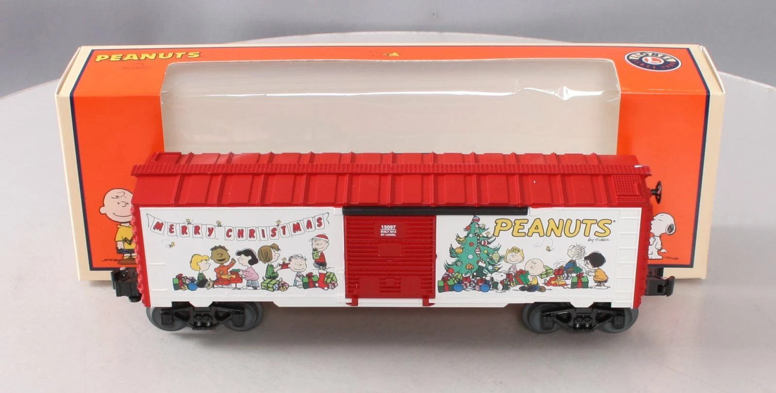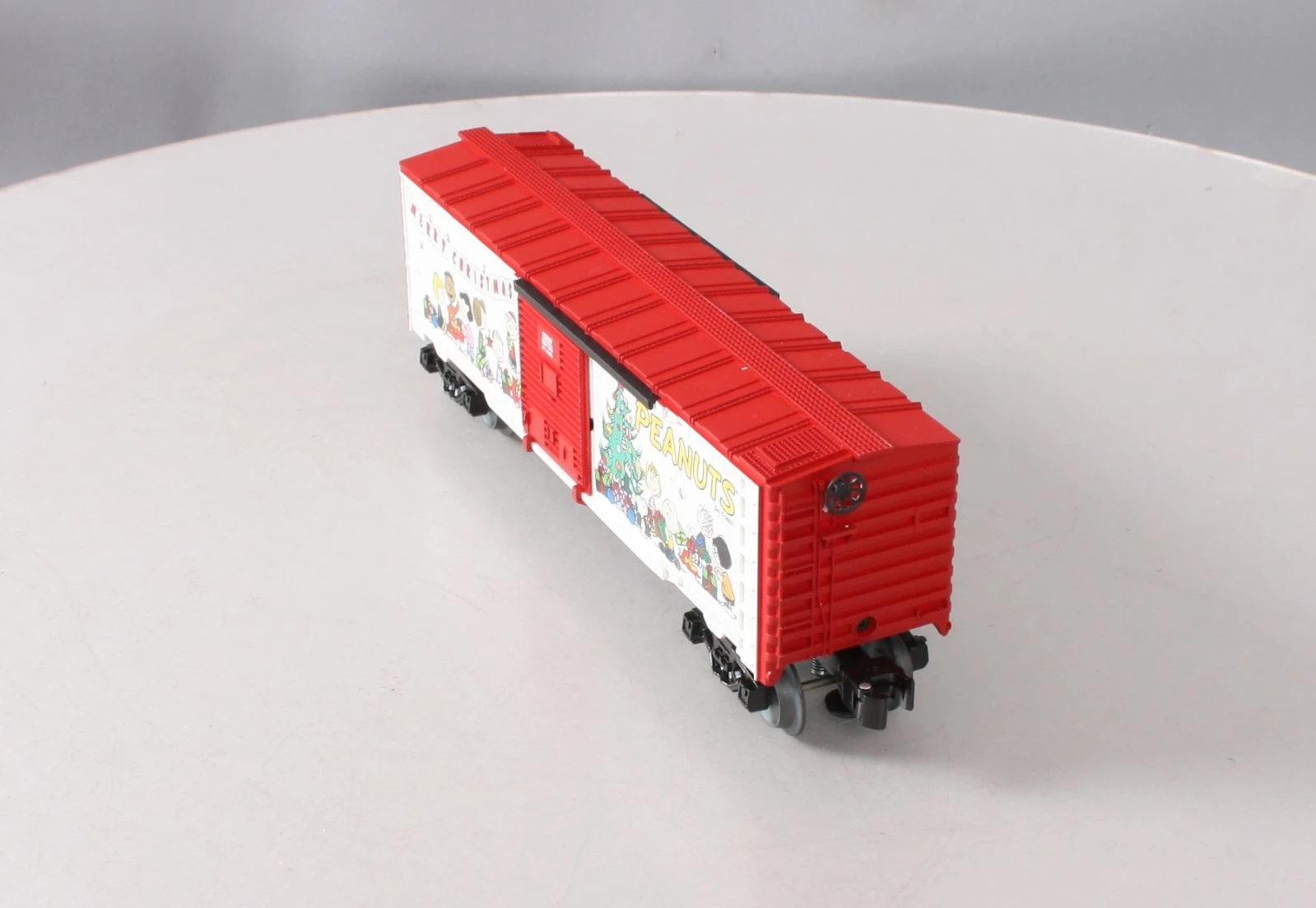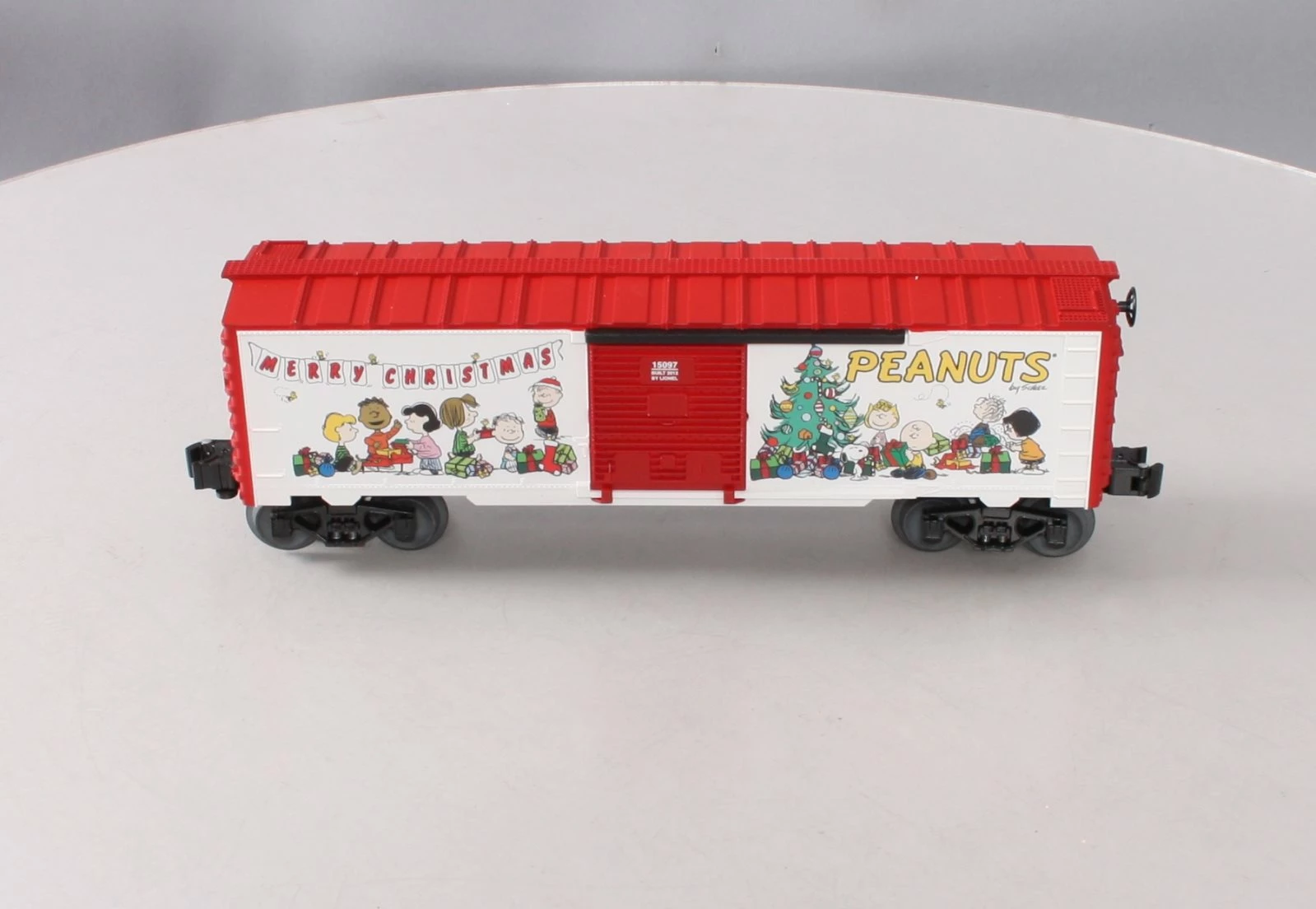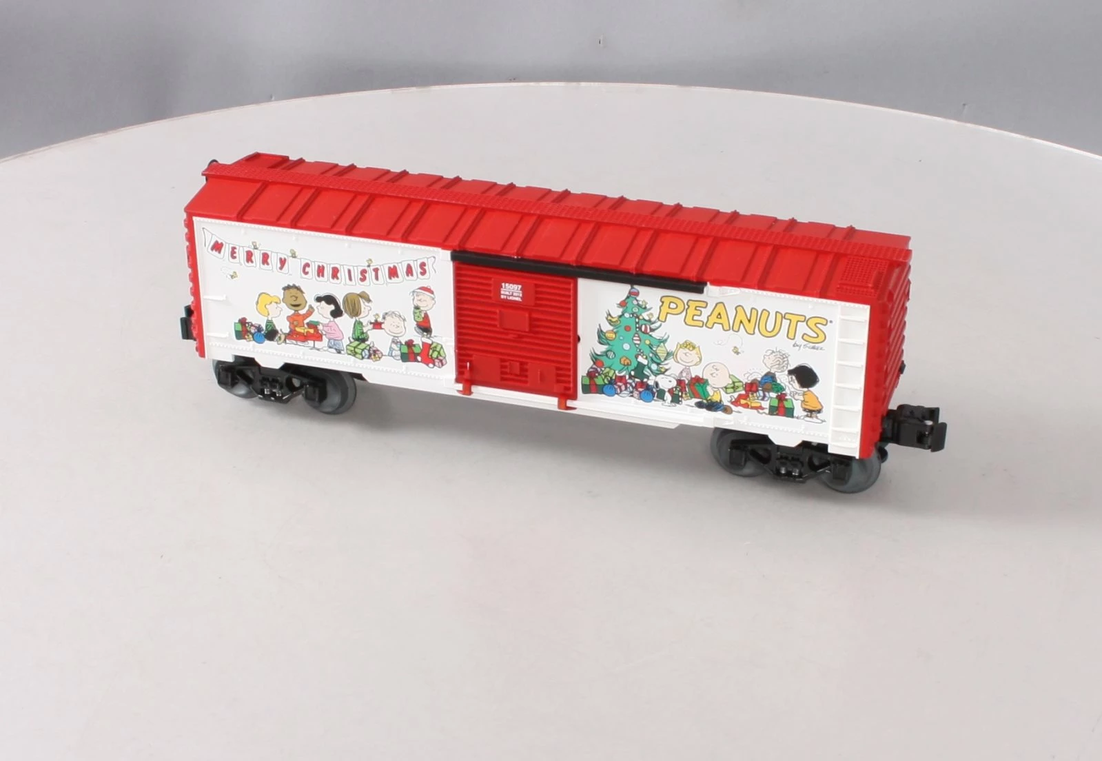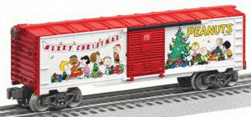 Lionel 6-15097 O Gauge USA/Peanuts Christmas Boxcar. This car features plastic construction, opening doors, metal frame, die-cast metal sprung trucks, die-cast operating knuckle couplers, metal wheels and axles.