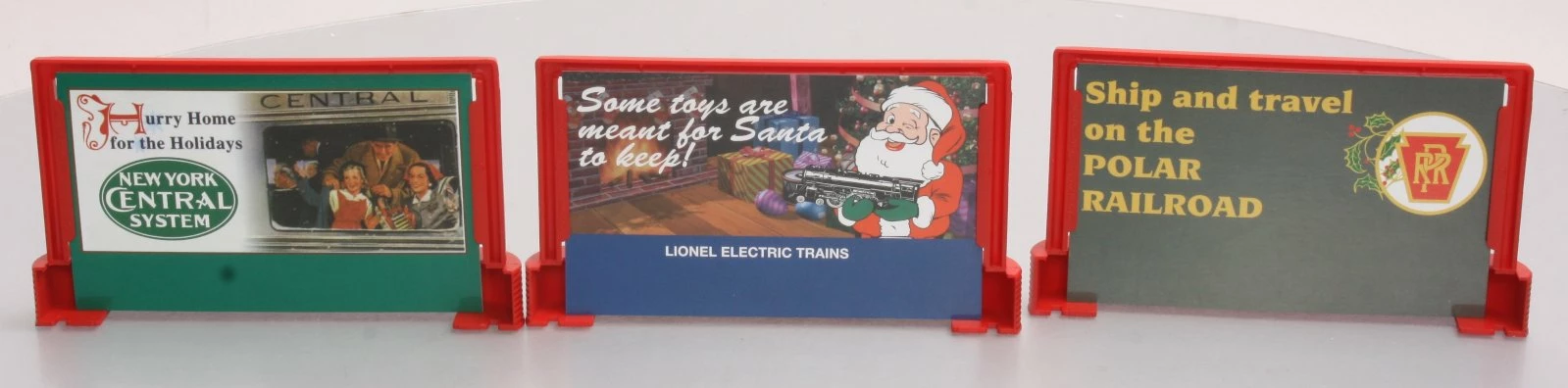 Here is a Lionel 6-35295 O Christmas Billboard Set. This set includes three billboards. These feature plastic construction. Please see my pictures for additional features.