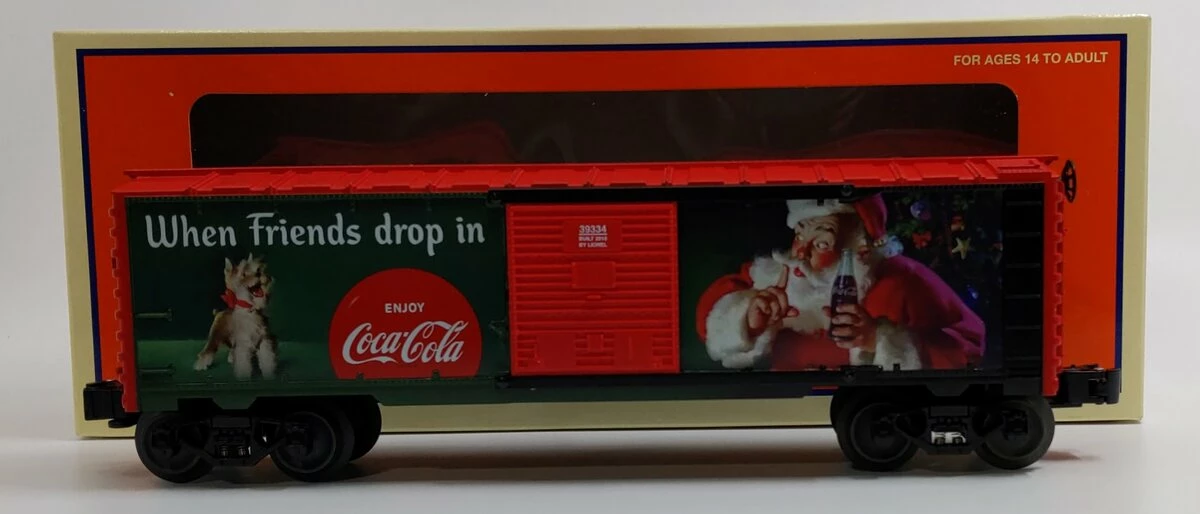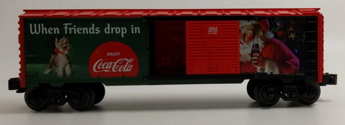 Here is a Lionel 6-39334 COCA-COLA Christmas Boxcar. This car features die-cast metal sprung trucks, operating knuckle couplers, metal wheels and axles.