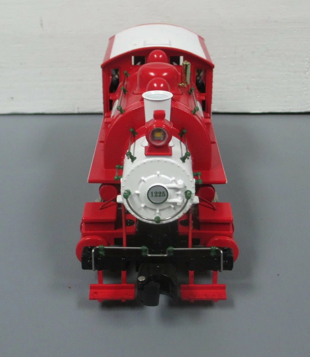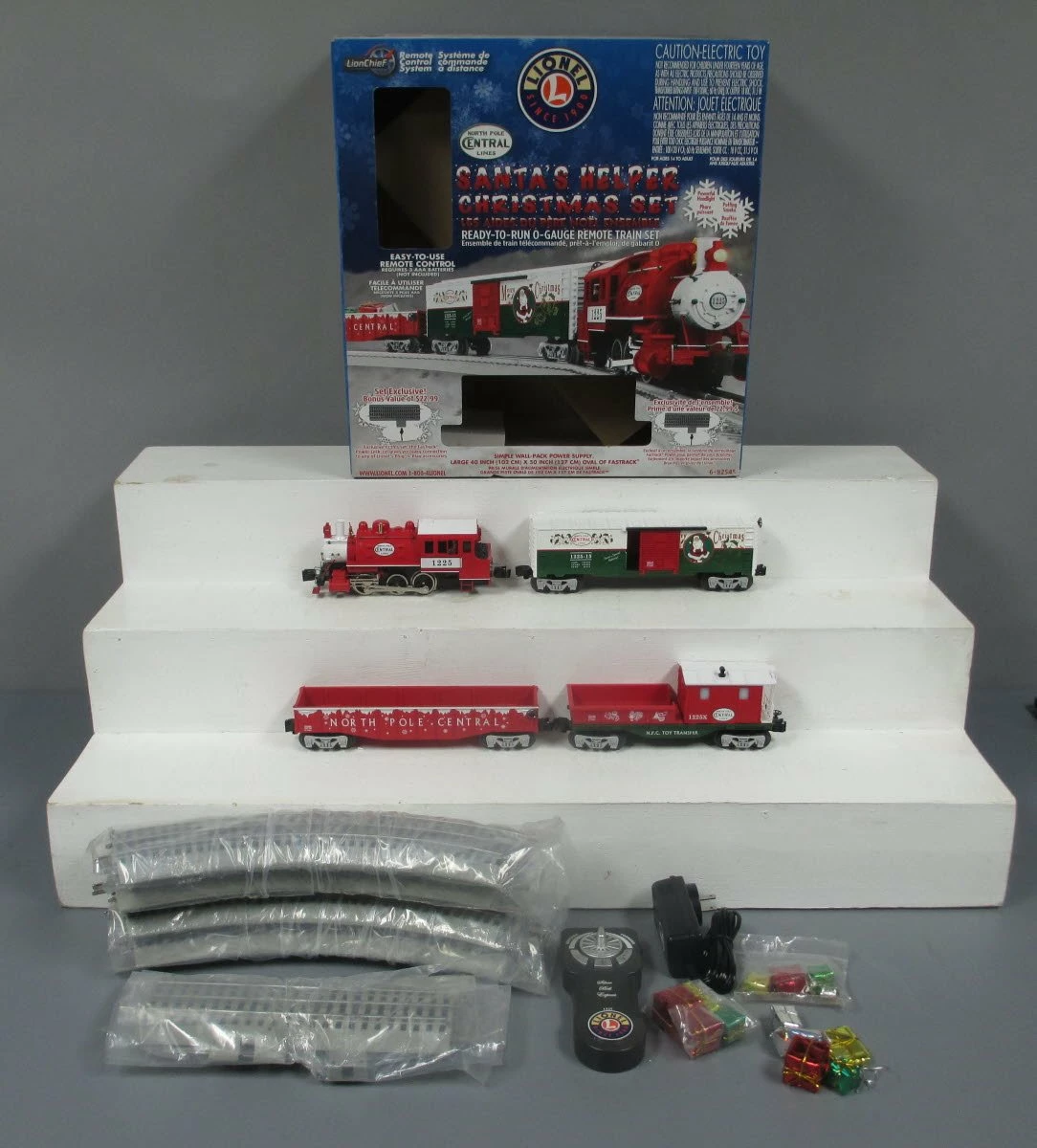 This is a Lionel 6-82545 O Scale North Pole Central Santa’s Helper Christmas Docksider Set #1225. Set Includes: 0-6-0 Dockside switcher, Boxcar, Gondola with presents, Work caboose, eight curved O36 FasTrack® track sections, one 10 FasTrack Plug-n-Play Lock-on track section, and one FasTrack terminal section. Wall-pack power supply, LionChief remote for locomotive. Locomotive Features: Electric locomotive controlled by remote, operating headlight and back-up light, directional lighting, puffing smoke, on/off switches for smoke and sound, RailSounds RC™ sound system with steam chuffing and background sounds, and user-activated whistle, bell and announcements, Chuffing sounds in synch with puffing smoke, die-cast metal locomotive body and frame, powerful maintenance-free motor, traction tires, engineer and fireman figures. Freight Cars Feature: Operating couplers, removable presents load in gondola, opening doors on boxcar.