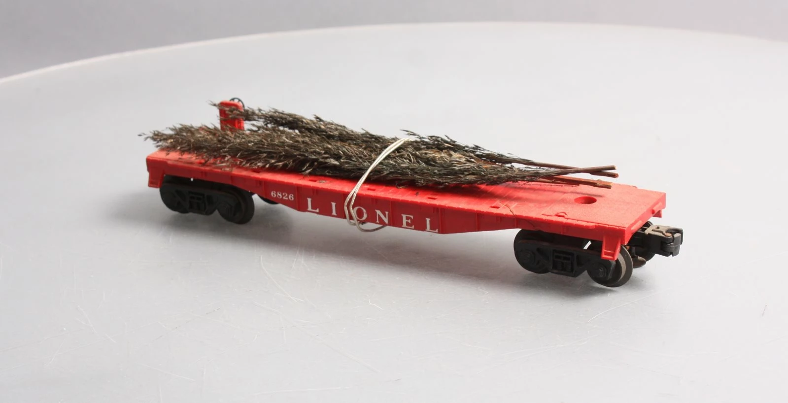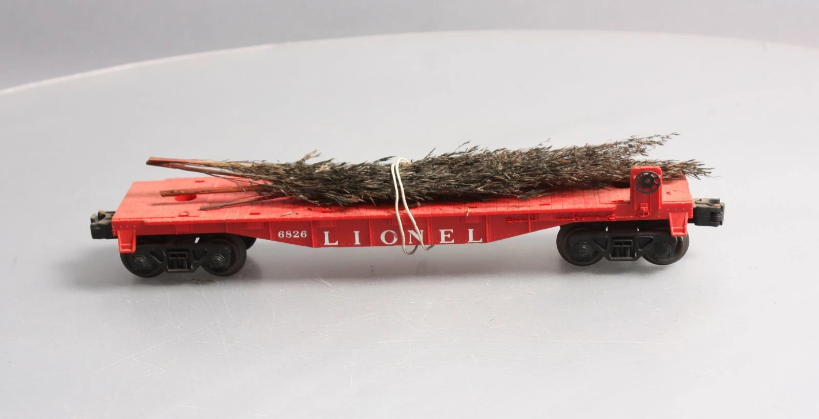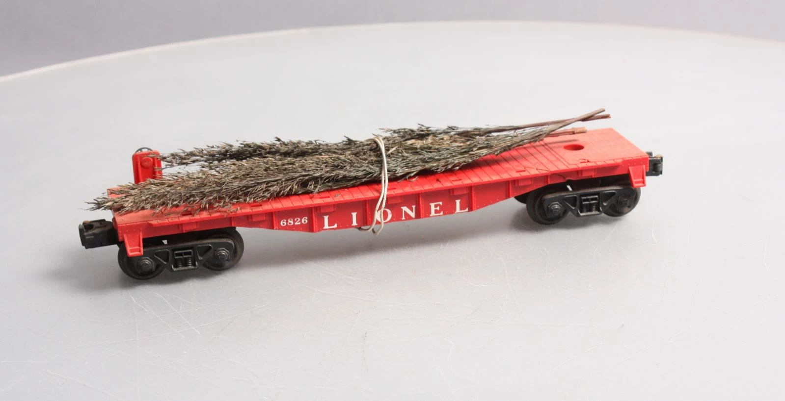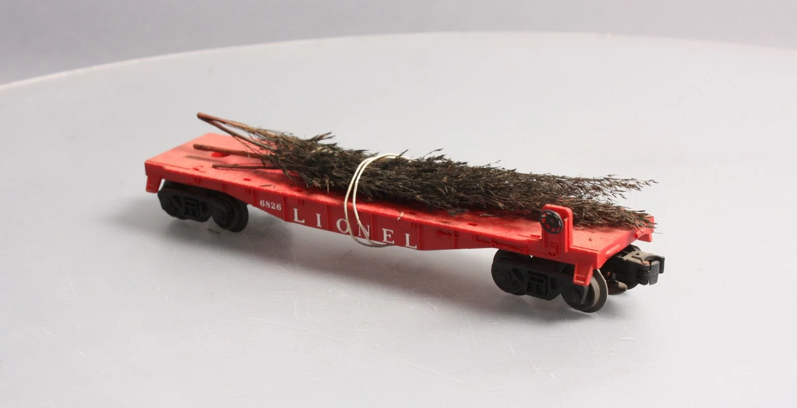 This is a Lionel 6826 Flatcar with Christmas Trees. This car features plastic trucks, operating knuckle couplers, and metal wheels and axles.