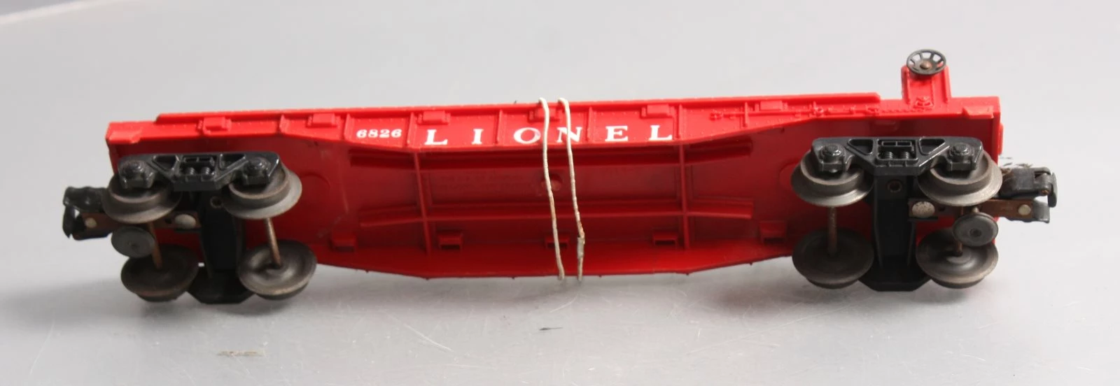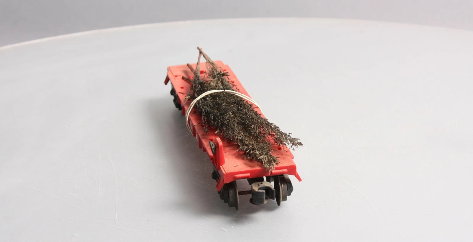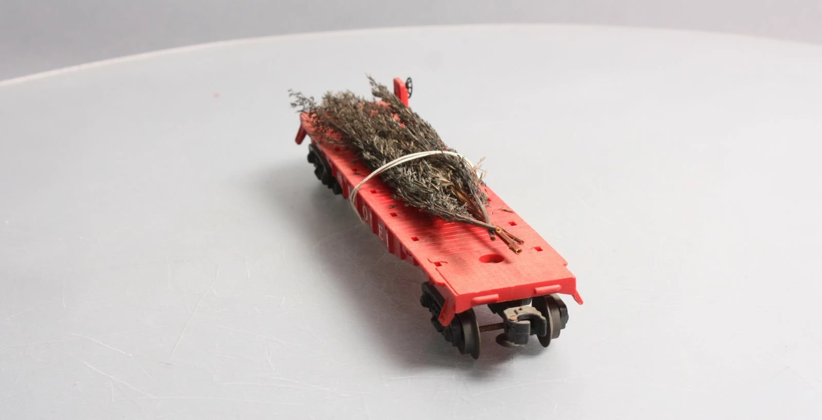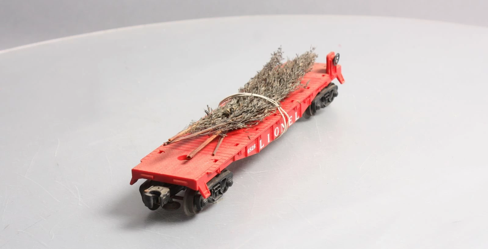 This is a Lionel 6826 Flatcar with Christmas Trees. This car features plastic trucks, operating knuckle couplers, and metal wheels and axles.