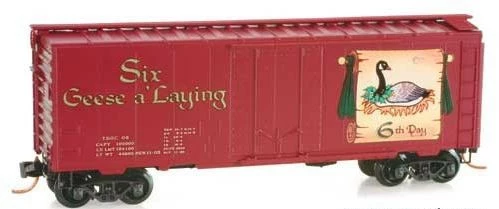 MicroTrains 02100506 N Scale Twelve Days of Christmas 40′ Standard Boxcar, Plug Door. This car feature plastic construction, plastic couplers and plastic wheels.