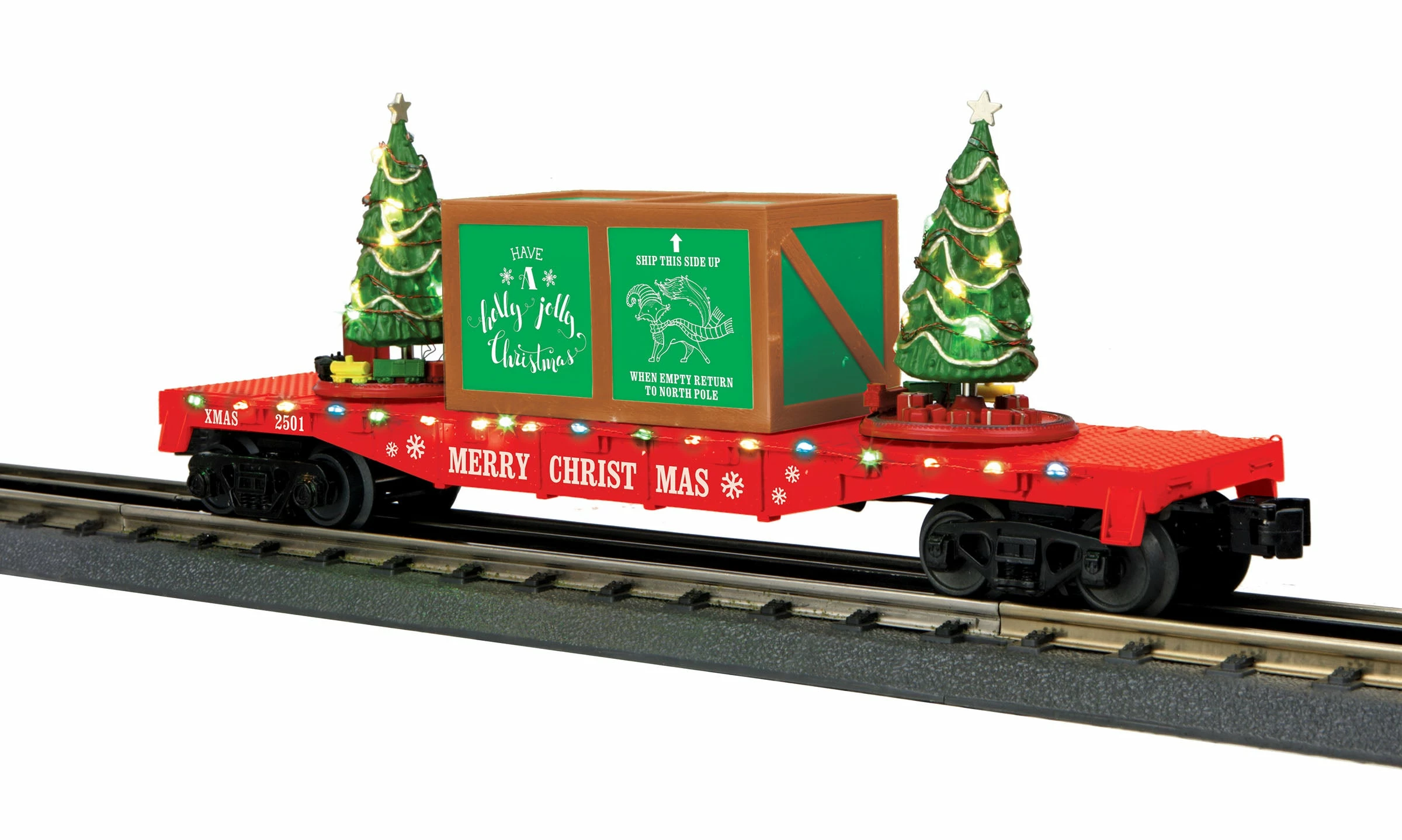 This is a MTH 30-76821 O Christmas RailKing Flatcar with Lighted Christmas Trees. Features: Intricately Detailed, Durable ABS Body, Metal Wheels and Axles, Die-Cast 4-Wheel Trucks, Operating Die-Cast Metal Couplers, Intricately Detailed Durable ABS Body, Decorative Brake Wheels, Separate Metal Handrails, Fast-Angle Wheel Sets, Needle-Point Axles, Operating Smoke, Unit Measures: 11 5/8 x 2 1/4 x 3 3/4, Operates On O-27 Curves