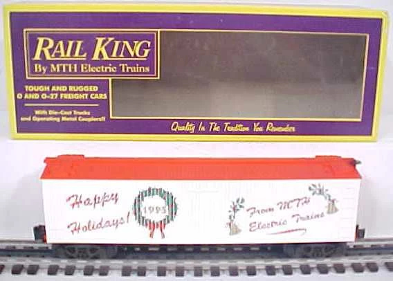 Here is an MTH 30-7805 Woodsided 1995 Holiday Reefer Car. This car features die cast trucks and operating couplers. It is from the RailKing line and will run on O-31 curves.