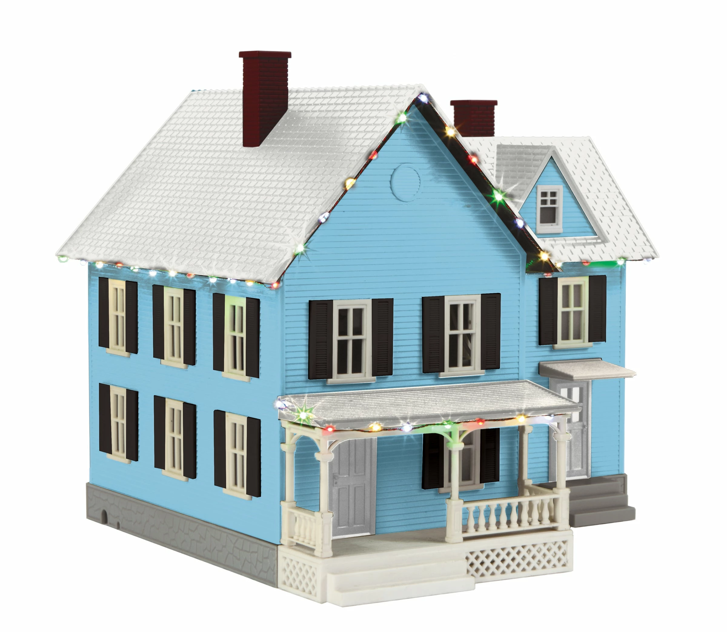 This is an MTH 30-90590 O RailKing #4 Country House with Operating Christmas Lights (Blue with Black Shutters and White Roof). Features: Intricately Detailed ABS. Construction. Fully Assembled. Fully Painted. Lighted Interior. Lighted Roof Multi-Colored LED Lights. Operates With Any AC or DC Power Supply. Unit Measures: 9 5/8 x 5 x 7.