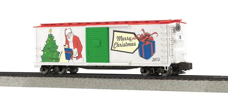 This is MTH 35-74001 CHRISTMAS STEEL BOXCAR. Rebuilt steel box xar, Christmas. Car number: 2013. During and after World War I, American railroads took delivery of tens of thousands of boxcars built to USRA designs: single or double-sheathed wooden sides, wooden doors, and steel ends, roofs and underframes. By the late 1920s, however, all-steel cars had become the norm, although new car construction slowed to a crawl during the Depression.