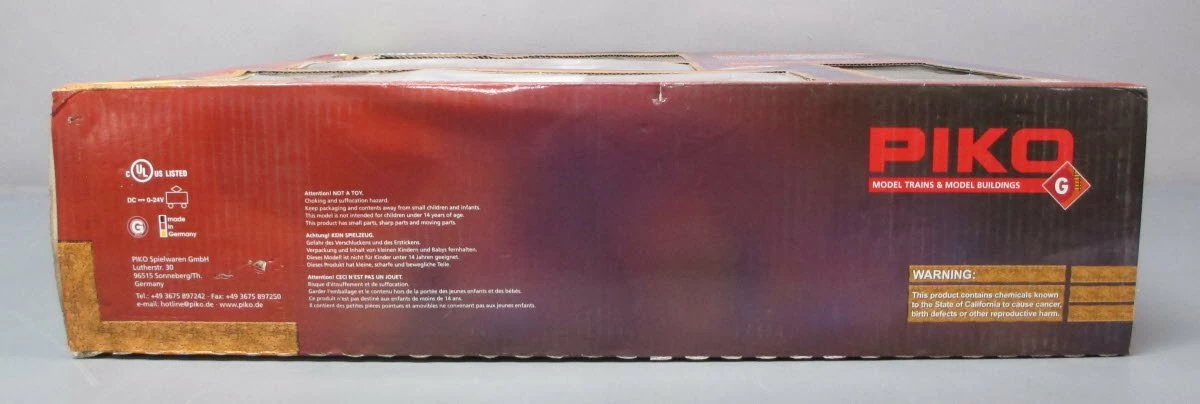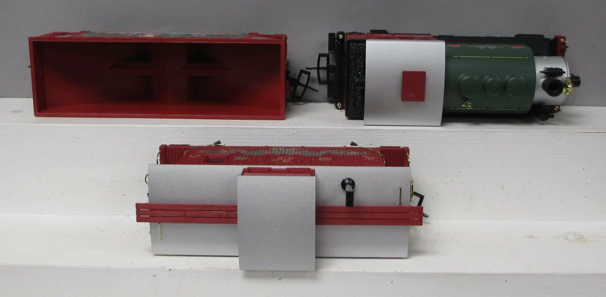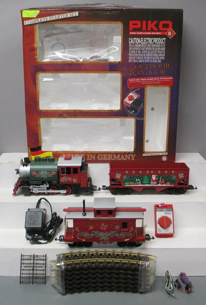 This is a Piko 38105 G Christmas Train Starter Set. PIKO G Starter Sets include everything needed to start a railroad empire:. Locomotive and 2 Cars. Circle of R1 Curve Track (12x 35211, R. = 600mm). Track Power Clamps (35270). Track Clips, 14 Pcs (35285). Throttle. UL/CSA Listed Transformer. These cars feature plastic construction, plastic trucks, latch couplers, and plastic wheels and axles. The locomotive features metal wheels and a motor.